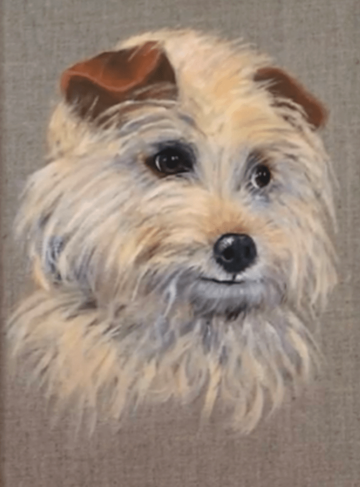 I went to visit Peggy Pickering a few months ago. I had my little terrier Mojo with me and Peggy was delighted to meet her. Although Peggy has been well known for her cat portraits, exhibiting at national exhibitions, she rather likes painting dogs. So she suggested she take some photos of Mojo and would come up with a portrait. Well, the portrait surpassed my expectations. I am thrilled with it.