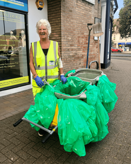 On our morning amble down the high street Mojo, the Shepperton Matters dog and I often meet Jean Davies and her trolley of rubbish bags. We will all recognise this smiley face. Jean walks the length and breadth of Shepper-ton every day from Sheep Walk to Gaston Bridge Road and Dockett Eddy Lane to Green Lane and everywhere in between, picking up rubbish and sweeping the pavement to make Shepperton look its best, the place we love. She does it with good humour, even during the recent heat wave, and loves her job. What an amazing lady! But what is also amazing is the amount of rubbish being dumped by those who don’t seem to care for our village! Jean has noticed an increase in rubbish this year. Do people not care? Smashed bottles litter the pavements almost daily, making it hazardous for dogs. Cans, wrappers, food boxes galore. There are plenty of bins in Shepperton so why leave rubbish for someone else?