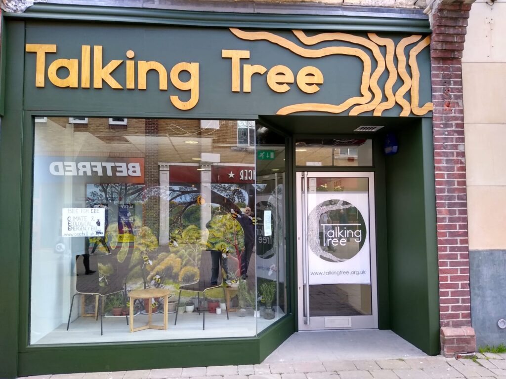 The main exhibition and performance space will provide an inspirational programme of arts, film, talks and music performance, while an adjacent meeting room and workshop will host local community groups and classes in practical skills to help participants live more sustainably. There will be a community fridge for residents to access surplus food from local suppliers and there are plans for a ‘library of things’ in the not-too-distant future. The en-tire refurbishment has been completed on a shoe-string with appliances, furniture and equipment mostly donated or salvaged and most labour being donated free of charge by volunteers who support the Talking Tree ethos. Even the beautiful fascia was crafted from the wood hoardings which blocked the doorway of the once derelict building which Talking Tree has transformed.