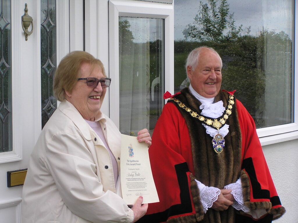Gladys Bolt is seen receiving her community award for 49 years working as the Patrol Crossing Keeper (‘Lollipop Lady’) in Nursery Road.